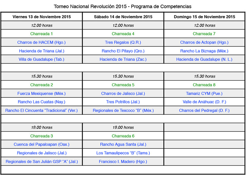 La cita inicia el viernes 13 y concluye el domingo 15 de Noviembre, apenas días antes de la conmemoración del inicio de la Revolución Mexicana, que le da nombre al evento, y que no hay mejor forma de festejar sino con las recias suertes que ejecutan las damas y caballeros de sombrero ancho.