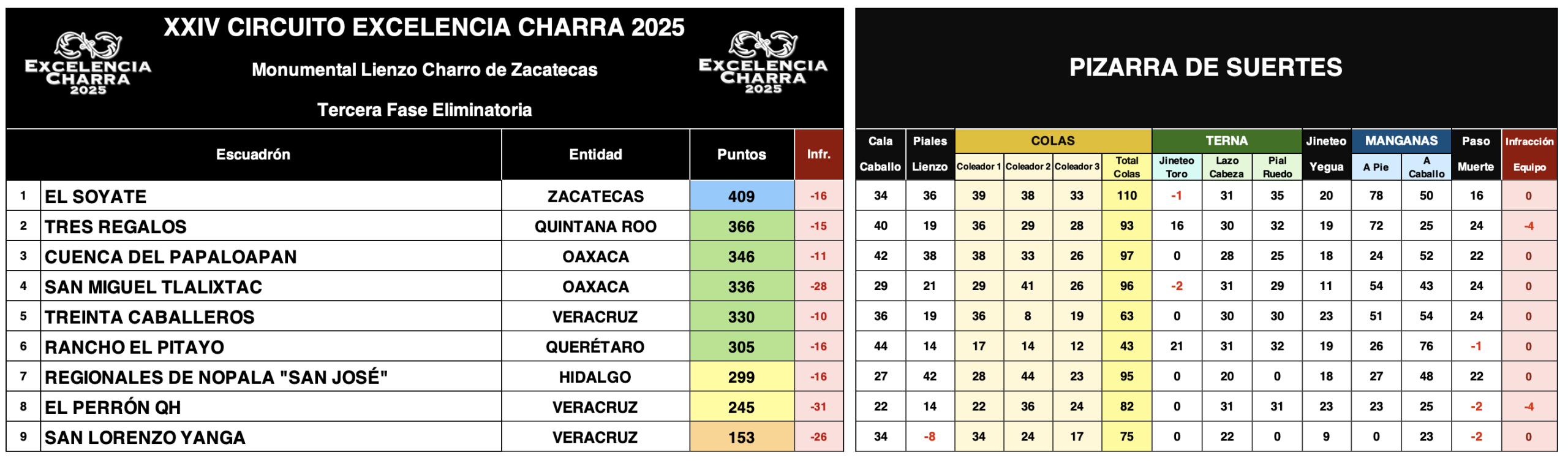 Ante un entusiasta público local, El Soyate de Zacatecas, atestiguado por el reconocido artista Pepe Aguilar, se encumbró como nuevo líder de la fase eliminatoria al sumar un total de 409 puntos.