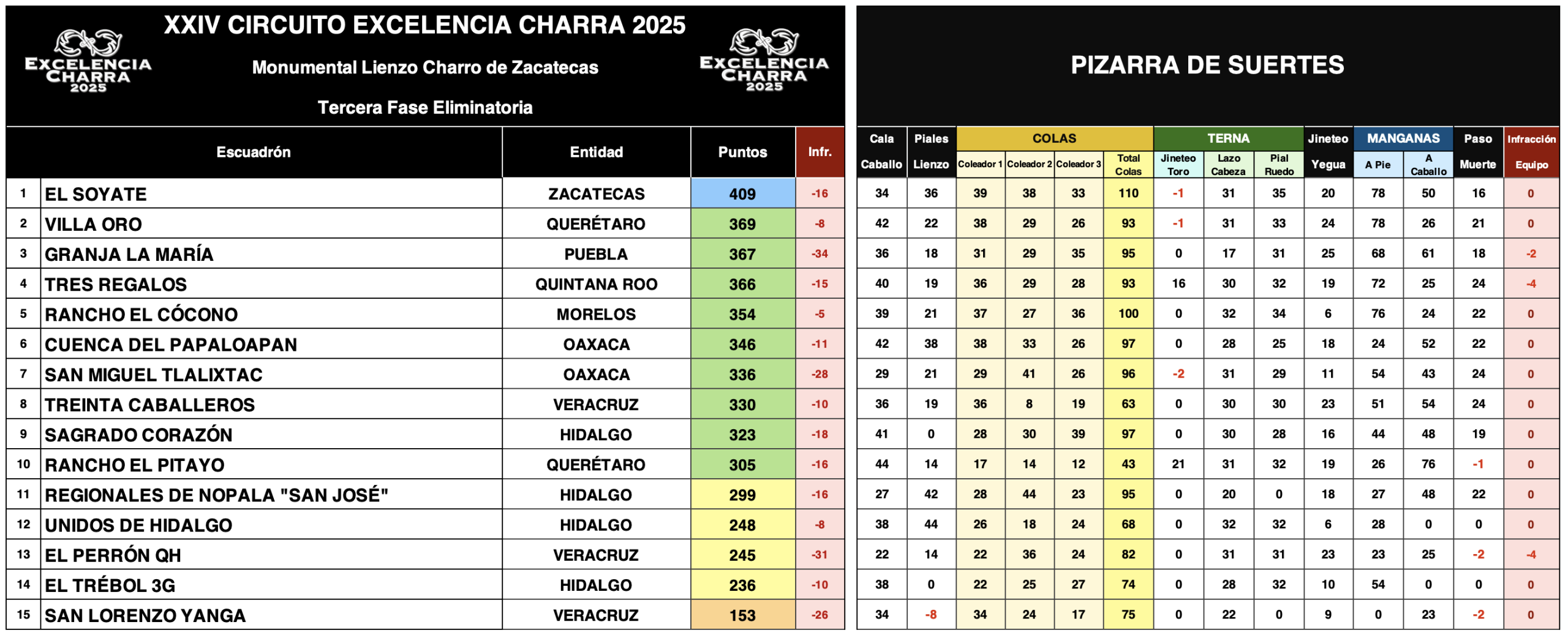 Con este resultado, Granja La María se coloca momentáneamente en tercer sitio, detrás del líder El Soyate, escuadra zacatecana que comanda la clasificación con 409 unidades, y a dos puntos de Villa Oro de Querétaro, sublíder con 369 tantos, aunque restan todavía siete charreadas por celebrarse.